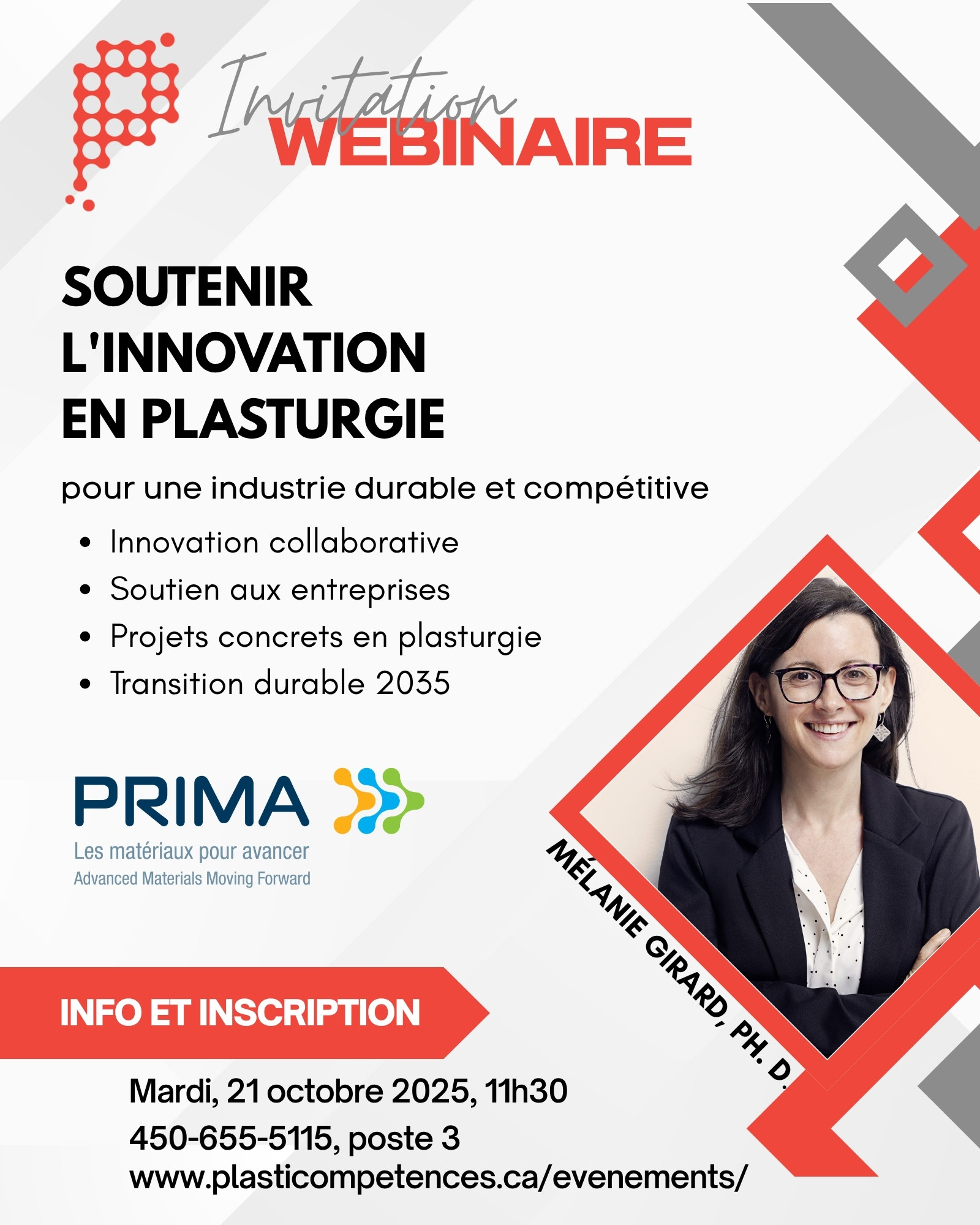 Nous vous proposons un webinaire présenté par Mélanie Girard, Conseillère en technologie, innovation et infrastructures, qui vous présentera PRIMA et des outils que l’organisme a initié (IRDQ, CQFA). Des exemples concrets de projets d’innovation en plasturgie seront aussi abordés, de même que la feuille de route Ambition 2035, mise en place par PRIMA, pour contribuer à répondre au défi de la décarbonation de l’économie. De plus, certaines ressources clés seront mises en évidence afin de soutenir les entreprises du secteur de la plasturgie dans leur transition vers un avenir plus durable.